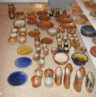 Here are the pots that made it. I refired about 25 more today in my little gas kiln. I have never done that before so we'll see if it helps in any way.Pots on the showroom floor after being sanded and dusted.